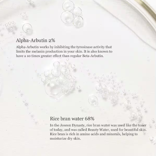 Rice extract provides natural brightening and skin smoothing benefits while arbutin gently reduces dark spots and hyperpigmentation. The serum formula delivers these concentrated ingredients for maximum effectiveness.