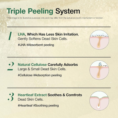 This Korean exfoliating gel features a unique formula that combines heartleaf extract's soothing properties with LHA (lipo-hydroxy acid) for gentle exfoliation. The gel transforms into gentle exfoliating particles that remove dead skin cells while providing moisture and soothing benefits.